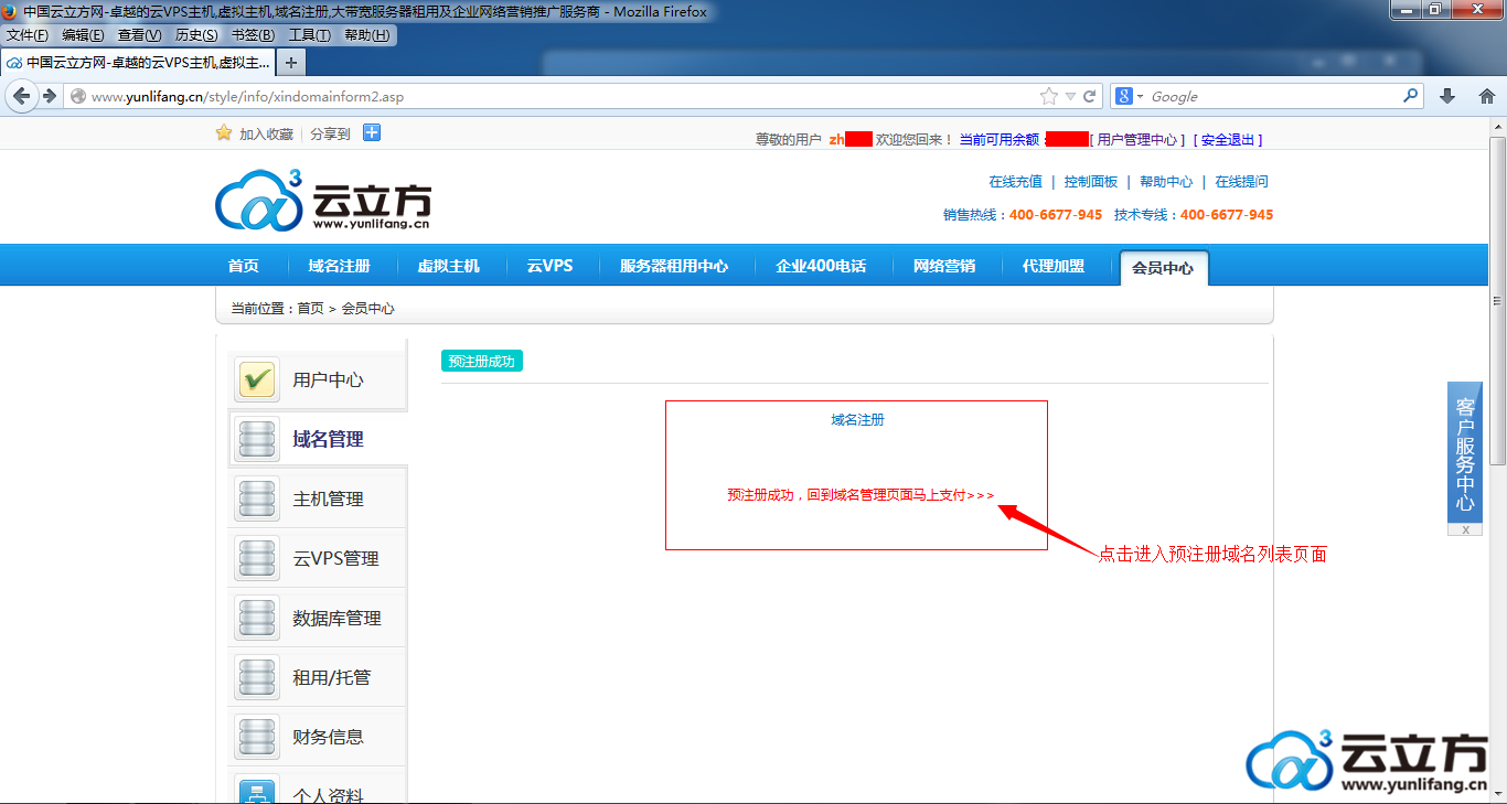 然后登陆云立方网站会员帐户,点击云立方网站首页导航条"域名注册"按钮,进入域名注册查询页面:
